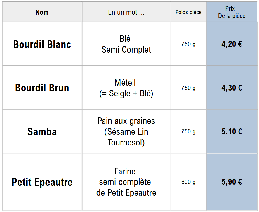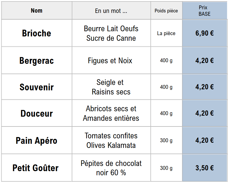 Voici l’ensemble des pains que je peux proposer, ils ne sont pas tous disponibles en même temps.