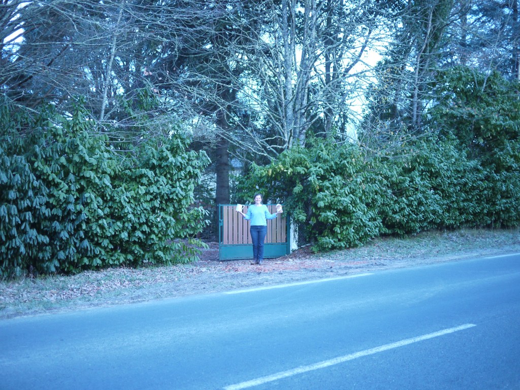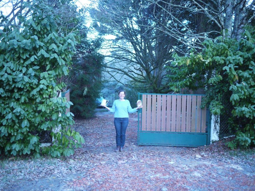 L’entrée exacte: il y a trois portails à cet endroit là. Un grand portail avec un panneau Le Bourdil Blanc, ce sont les chambres d’hôte des voisins, un portail en bois au centre et un portail vert sur la gauche… c’est le mien !